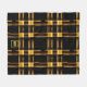 This is a sleek, modern plaid blanket featuring a bold combination of black and gold, perfect for adding a touch of sophistication to any space. The design includes abstract golden plaid lines, creating a dynamic and contemporary aesthetic. The monogram in the bottom offers a personal touch and can be customised with initials, making it an ideal gift or a stylish addition to your home decor.