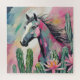 A vibrant, modern abstract painting depicting a horse surrounded by cacti and succulents in soft pastel colours. The horse is rendered with splashes of bold colour, while the desert plants are painted with a mix of muted greens, pinks, and blues. The fusion of organic forms and lively hues creates a playful yet calming composition, blending natural elements with a contemporary artistic flair.