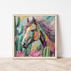 A vibrant, modern abstract painting depicting a horse surrounded by cacti and succulents in soft pastel colours. The horse is rendered with splashes of bold colour, while the desert plants are painted with a mix of muted greens, pinks, and blues. The fusion of organic forms and lively hues creates a playful yet calming composition, blending natural elements with a contemporary artistic flair.