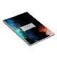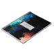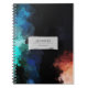 A personalized notebook with a modern abstract design. Paint splatters and swirling colors in turquoise, white, orange and black with hints of blue.