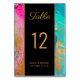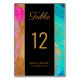 Elegant sophisticated acrylic painting wedding table card in vibrant hot pink, teal, yellow gold, and black colour palette with abstract brushstrokes and faux gold modern contemporary fully editable typography script. ++++++++++ The card is suitable for all seasons trendy urban chic style wedding receptions