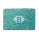 Retro modern bath mat with a custom monogram in a semi-abstract, all over pattern of roses and buds - mixed media digital art in deep teal / turquoise and light aqua