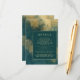 This modern wedding details enclosure card features a teal blue and gold abstract watercolor background. Customise the gold-coloured text in stylish fonts on a dark teal rectangle. The abstract design is repeated on the back of the card.