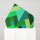 Tissue paper in a Mid-Century Modern design of layered triangles in shades of deep emerald green, lime, aqua, teal, and turquoise