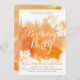 Modern abstract watercolor splash orange fall birthday party invitation showcasing a hand painted watercolor paint splash with texture in orange, maple leaves in white with coral veins and text in white and grey.