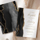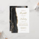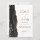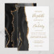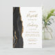 The left-hand edge of this elegant modern wedding invitation features a black watercolor agate border trimmed with faux gold glitter. The customizable text combines gold-colored handwriting, copperplate and italic fonts on a white background. The reverse side features a matching black and gold agate design.