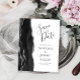 This elegant modern save the date postcard features a black watercolor agate border trimmed with faux silver glitter. The customisable text is charcoal grey on a white background. The reverse side repeats the information, along with a customisable return address.
