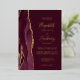 The left-hand edge of this elegant modern wedding invitation features a burgundy red watercolor agate border trimmed with faux gold glitter. The customisable text combines handwriting, copperplate and italic fonts in real gold foil on a burgundy red background. The reverse side features a matching burgundy and gold agate design.