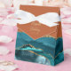 This elegant modern favour box features a teal blue watercolor agate design trimmed with gold faux glitter. Personalise it with the names of the bride and groom in gold-coloured handwriting script over a large ampersand on a burnt orange background, with the wedding date below.