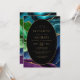 A bold watercolor agate frame in shades of teal blue, green, navy blue and purple trimmed with gold faux glitter provides the setting for the gold-coloured text on a black oval background. The reverse side provides space for wedding details, along with a QR code guests can scan to visit your website and RSVP, which saves the cost of printing and mailing separate RSVP cards.