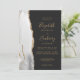 The left-hand edge of this elegant modern wedding invitation features a gray and white watercolor agate border trimmed with faux gold glitter. The customizable text combines gold-colored handwriting, copperplate and italic fonts on an off-black background. The reverse side features a matching agate design.