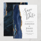 This elegant modern save the date card features a navy blue watercolor agate border trimmed with faux gold glitter. The customisable text is charcoal grey on a white background. The reverse side features a matching navy blue and gold agate design.