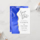 This elegant modern save the date card features a royal blue watercolor agate border trimmed with faux gold glitter. The customisable text is charcoal grey on a white background. The reverse side features a matching royal blue and gold agate design.
