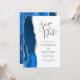 This elegant modern save the date card features a royal blue watercolor agate border trimmed with faux silver glitter. The customisable text is charcoal grey on a white background. The reverse side features a matching royal blue and silver agate design.