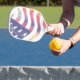 Create your own personalised custom pickleball paddle featuring an American flag with a name, monogram or other text in your choice of font style and colour (shown in blue. Make one for yourself or as a gift for the patriotic pickler or pickleball player you know. PADDLE OPTIONS: Choose from Black, Tan or White edging and grip colours on the ordering page. ASSISTANCE: For help with design modification or personalisation, colour change, transferring the design to another product or if you would like coordinating items, contact the designer BEFORE ORDERING via the Zazzle Chat MESSAGE tab below or email makeitaboutyoustore@gmail.com.