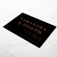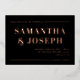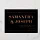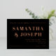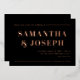 These simple yet statement-making wedding invitations feature modern, bold rose gold foil text on a moody, dark black background, with rose gold foil lines accenting the layout.