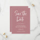 This ultra modern, on-trend wedding save the date card features a mix of trendy white handwritten script typography and slab serif text, on a dusty rose coloured background. An elegant and simple announcement that will stand out as soon as your guests open the envelope.
