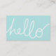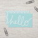 Modern trendy typography Hello business card in aqua background colour, which can be customised to match your business. Elegant Lattice pattern on the backside.