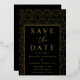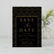 Elegant, art deco wedding save the date featuring a gold foil arch pattern with a black background. Personalise the modern art deco save the dates with your names and wedding details gold foil lettering.