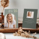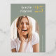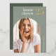 Modern photo graduation announcement features a vertical or portrait orientated photo in a unique arched layout, on a sage green background accented with gold foil trim. The graduate's name and graduation year appear at the top, with the school name at the lower right. Add a personal message to the back, along with an additional photo.