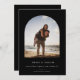 Modern arch frame, flat save the date photo card. Minimalist typography design style template with solid black colour backgrounds.