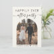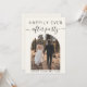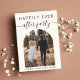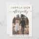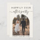 Modern light cream elopement or private wedding announcement and reception invitation. The front features your photo in a boho-inspired arch frame and "Happily Ever After Party" in simple typography and a stylish script with swashes. Add your first names and wedding or reception date. On the back, personalise your details and add your names in a signature-like script.