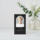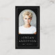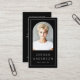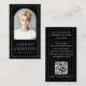 Modern, vertical, black or custom colour business cards with your arch shaped photo, name and title on the front, with a thin white border along the edge of the card. Customisable template fields for your contact information, social media and QR code on the back. You can change background and font colours, move and resize elements with the design tool.
