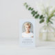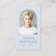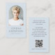 Modern, vertical, light dusty blue or custom colour business cards with your arch shaped photo, name and title on the front, with a thin, white border along the edge of the card. Customisable template fields for your contact information, social media and QR code on the back. You can change background and font colours, move and resize elements with the design tool.