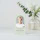 Modern, vertical, light sage green or custom colour business cards with your arch shaped photo, name and title on the front, with a thin, white border along the edge of the card. Customisable template fields for your contact information, social media and QR code on the back. You can change background and font colours, move and resize elements with the design tool.