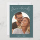Modern and elegant script arch photo Free Drinks (and we're getting married) design save the dates for your beach wedding (or any wedding celebration!). Customise the front with photo and wedding details and the backside with your text.