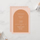 A modern minimalist wedding invitation with a retro vibe, featuring a terracotta arch on a blush pink background with contrasting white text. The reverse features a blush background with terracotta pinstripes. All colours are editable.