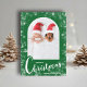 Arched at the top, your favorite photo is outlined in white on a green background and features Merry Christmas in chic lettering along with your names on the bottom.