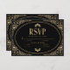 A modern and chic wedding rsvp card with faux gold deco art borders and vintage fonts in black background with QR code to rsvp.