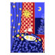 Modern and decorative digital artwork in expressive and bold colours representing a night scene with the Moon seen from a window of an interior with a table covered with blue cloth with botanical pattern, blue curtains with floral pattern, red chequered wall with a sun ornament. A plate with some lemons, grapes and apples scattered on the table, a bottle and a glass of red wine. This genuine artwork by Tanjica is greatly inspired by Henri Matisse and is not a copy of any of his masterpieces.