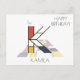 Brilliant, funny, artistic monogram. Here is the letter "K". Neoplasticism style, or De Stijl, line and colour artistic decoration, the funny bird sits on the letter. The field of art is located under the letter. The template name "KAMILA" is located under the image. Happy Birthday! text near the image. You can change or delete all the texts, and you can change the image. Unique, one-of-a-kind postcard for a birthday or another event. Feel free to use the "Edit Design" or "Personalise" (as the case may be) button of the blue colour to change the font, colour, or position of the template text. Be creative, customise, buy one, and be happy!