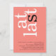 Modern At Last Coral Rose Engagement Party. A stylish typographical design, with At Last in large text rotated and to the left hand side at the top in white and black on a background of coral rose. Background colour on both sides can be changed if you wish via Customise further.