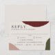 An artistically styled wedding response card that conveys simple elegance, this design has a rich autumn colour palette in burgundy wine red, terra-cotta and hunter green abstract shapes along the edges of the design. An ecru background blends well with the fall colours. The type face is crisp and elegant in its simplicity. This RSVP card has a text template that includes menu entree selections for your guest to select their preferred meal choice. You can personalise the mail choices with your own wording as well as the required RSVP date.
