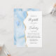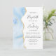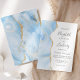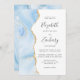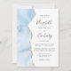 The left-hand edge of this elegant modern wedding invitation features a pastel baby blue watercolor agate border trimmed with faux gold glitter. The customisable text combines handwriting, copperplate and italic fonts in charcoal grey on a white background. The reverse side features a matching baby blue and gold agate design.