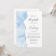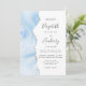 The left-hand edge of this elegant modern wedding invitation features a pastel baby blue watercolor agate border trimmed with faux silver glitter. The customisable text combines handwriting, copperplate and italic fonts in charcoal grey on a white background. The reverse side provides space for wedding details on a solid white background, along with a QR code guests can scan to visit your website and RSVP, which saves the cost of printing and mailing separate RSVP cards.