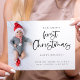 Modern Baby First Christmas Custom Photo Card. Available digitally and printed. Lovely to celebrate your baby's first Christmas. A playful set script for First Christmas and the rest of the text is easy to personalise. Replace the sample photo with your own. A gradient overlay layer is on top of your photo so it fades out as it reaches the centre with the text partially overlaid on top.