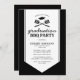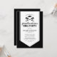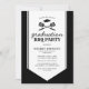 Summer backyard bbq graduation party invitations featuring a classic black background, a white graduation sash centrepiece, a mortarboard cap, barbecue utensils, and a modern text template that is easy to personalise. On the back is a rustic plaid pattern.