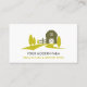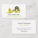 Simple professional farming business card featuring a modern barn standing in green lawn ad trees. OLIVE AND LIME GREEN COLOR PALETTE.