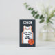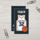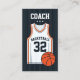 A modern business card for a basketball coach. The front of the business card design features the title COACH in large bold letters. It shows an illustrated vector design of a basketball jersey, including the team name and jersey number, which can both be personalised. The back of the coach business card design include the name and contact details. Font style, colour size can be personalised using the full Zazzle editor.