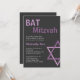 A modern Bat Mitzvah invitation that features the words Bat Mitzvah at the top and purple Star of David.