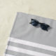White stripes on a light grey background and a customisable family name on the bottom. Check our store for more monogram beach towel options.