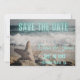 Modern, non-traditional Save the Date announcement features muted beach scene (that includes waves and starfish in the sand) photography background with Save the Date in aqua blue neon. Personalise with wedding couple's details.