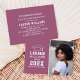 Announce your high school or college graduate in style with this graduation announcement and party invitation. Two-sided card features a senior portrait of the graduate with grad cap and simple and modern white typography design. Berry pink / red background can be changed to a different colour with the "Customise It" feature, then Edit / Background to select another colour.