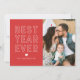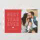 Send your loved ones a stylish holiday photo card this holiday season! The modern photo card features a red background, the phrase "Best Year Ever" in a trendy font, placeholders for your custom text and photo, and a red and white geometric pattern on the back of the card.