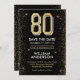 This fabulous black & gold men's 80th birthday party Save the Date card featuring the number 80 in gold with modern fonts and gold glitter sides would be perfect for asking people to put this special date aside for the man in your life's upcoming 80th Birthday Party. It is traditional and classic while being fresh, modern and contemporary. To see your unique save the date cards select "Personalise this template" and type in your information. It's super easy!
