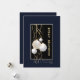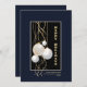 A sophisticated Happy Holidays greeting card featuring white and gold hanging ribbons and ornaments on a black and blue background for you to share the joy of the festive season. Customise your details in the information provided below the image.